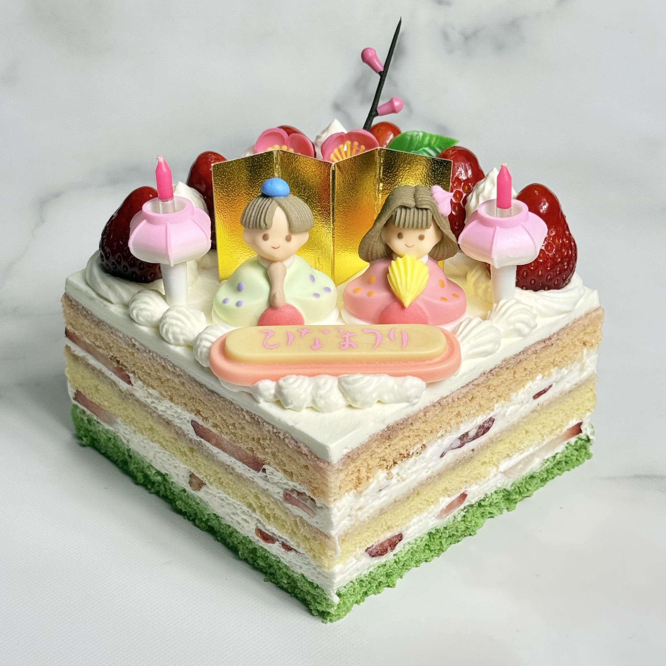 ひし餅をイメージした3色(いちご・プレーン・ピスタチオ)のスポンジに、甘酸っぱいイチゴをサンド🍓